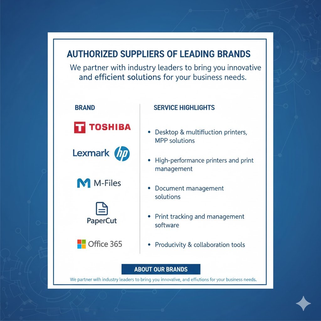 We are authorized suppliers of Toshiba, Lexmark, HP, M-Files, PaperCut, and Microsoft Office 365, ensuring reliable solutions for your business.